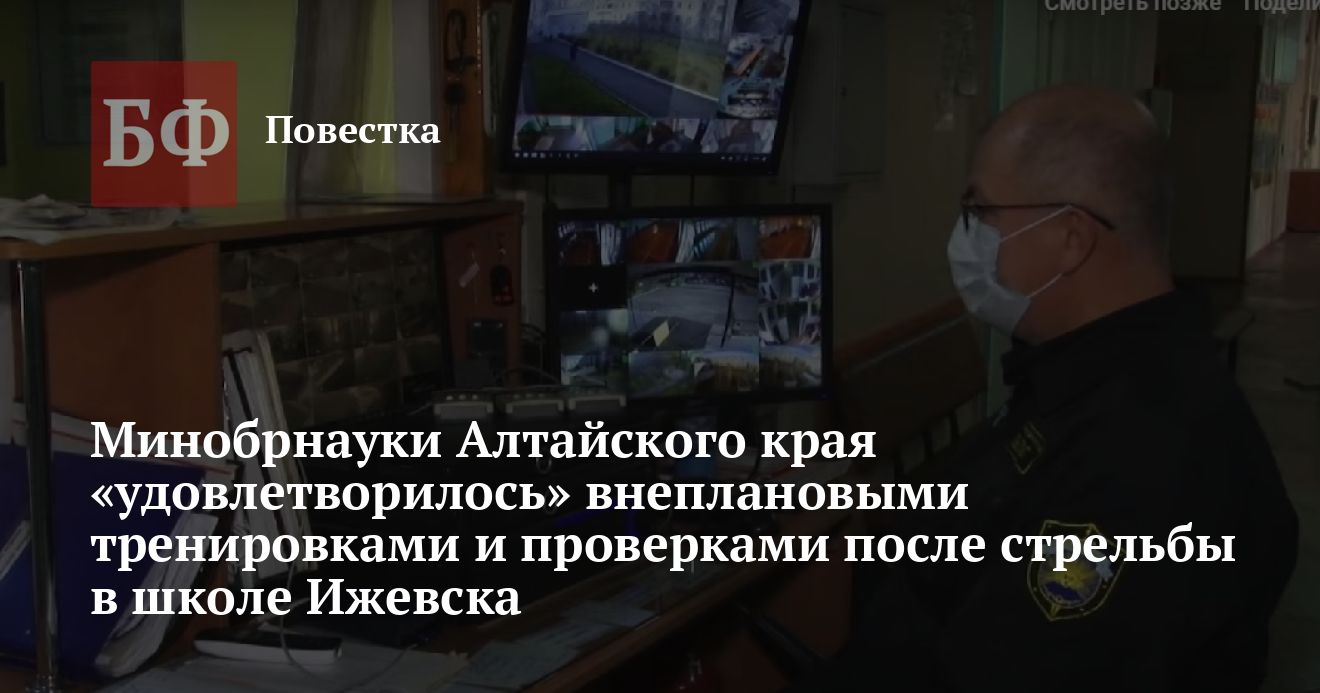26 сентября в школе № 88 Ижевска произошла стрельба — погибло 17 человек. На следующий день после трагедии ИА «Банкфакс» обратилось в пресс-службу Минобрнауки Алтайского края с вопросом о том, будет ли ведомство принимать меры для усиления безопасности в школах региона. Там заявили, что с конкретными действиями здесь определятся в течение суток.