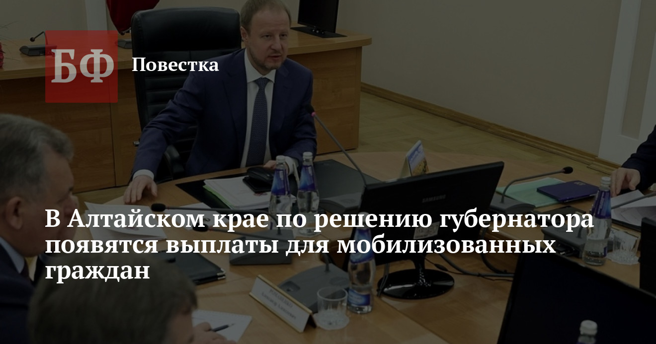 Глава края сообщил, что алтайское правительство проанализировало вопросы, связанные с частичной мобилизацией и организацией поддержки семьям. Они обсуждались в том числе на прошлой неделе в Кемерове на совещании с полпредом президента в СФО Анатолием Серышевым и губернаторами других регионов Сибири. По поручению Виктора Томенко изучены финансовые возможности бюджета, и в результате были определены ресурсы, которые направят на помощь мобилизованным жителям. «Мною принято решение о выплате по 100 тысяч рублей каждому военнослужащему, призванному в ходе частичной мобилизации. Министерству социальной защиты края поручено подготовить такой документ. Министерству финансов Алтайского края — определить источники финансирования, в случае необходимости скорректировать проект закона о поправках в краевой бюджет на 2022 год, который на текущей неделе будет внесен в Алтайское краевое Законодательное Собрание», — заявил губернатор.