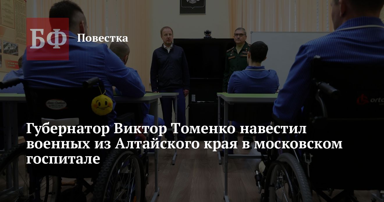 Глава Алтайского края посетил военный госпиталь, где проходят лечение и реабилитацию бойцы из региона. Как сообщила пресс-служба правительства, Виктор Томенко пообщался с военнослужащими, ответил на их вопросы, в том числе о мерах поддержки для инвалидов. Сам он также рассказал о встрече в своих соцсетях.