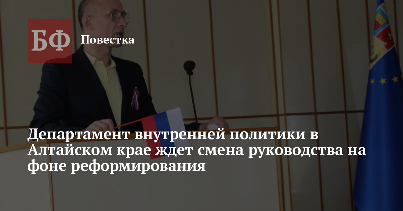 Инсайдеры также полагают, что и сам департамент внутренней политики может ждать реорганизация. Из его структуры будто бы уже вывели ряд специалистов, курирующих национальные вопросы. Их, по имеющимся сведениям, могли перевести в департамент администрации губернатора и правительства Алтайского края по взаимодействию с федеральными органами государственной власти, возглавляемый Игорем Федоровым. Эта структура, по информации редакции, тоже может претерпеть некоторые изменения. Эти процессы источники связывают с реформами, которые, по их сведениям, якобы в целом затрагивают аппарат.