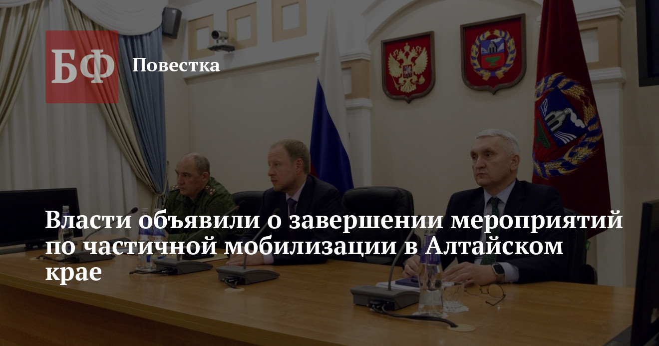 По сообщению пресс-службы правительства Алтайского края, состоялось совещание регионального оперативного штаба по обеспечению безопасности в регионе и поддержке Вооруженных сил России. На нем военный комиссар Марат Усманов сообщил главе Виктору Томенко, что частичная мобилизация в регионе завершена. Составлять и вручать повестки запасникам больше не будут.
