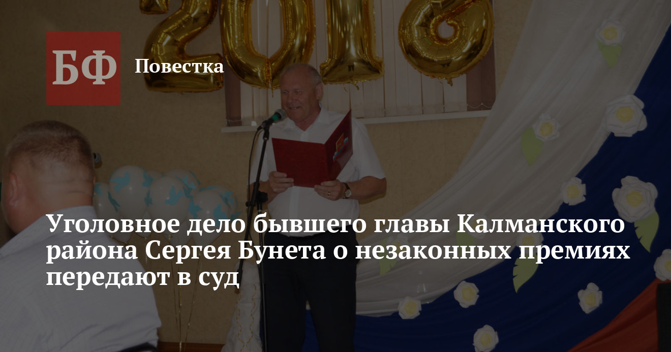 Правоохранители завершили расследование уголовного дела о незаконном «самопремировании» бывшего главы Калманского района Сергея Бунета. Об этом сообщают источники «Банкфакса». В ближайшее время материалы должны быть переданы в суд. При этом стоит отметить, что действия экс-руководителя муниципалитета переквалифицировали на мошенничество. Ему может грозить до 6 лет лишения свободы.