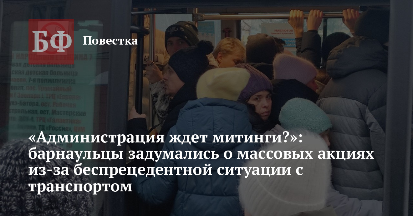 Проблемы с пассажирским сообщением в Барнауле обсуждают в СМИ и соцсетях уже в ежедневном режиме. В частности, 23 ноября «Амител» опубликовал фоторепортаж под заголовком «Вечерний квест — попади в автобус». Его автор запечатлел горожан, которые с трудом пробираются в транспорт на остановке «Площадь Победы» на проспекте Строителей. Днем ранее «Вести-Алтай» выпустили сюжет, в котором шла речь о том же самом — автобусы переполнены. Одновременно посты о проблеме появляются в городских пабликах, перемежаясь со свидетельствами плохого технического состояния машин — они ездят со сломанным днищем, демонтированными сиденьями и протекающими крышами. Горожане спрашивают, чего ждет администрация Барнаула, и предлагают писать губернатору или президенту. Уже звучат и идеи провести публичную акцию на эту волнующую тему.
