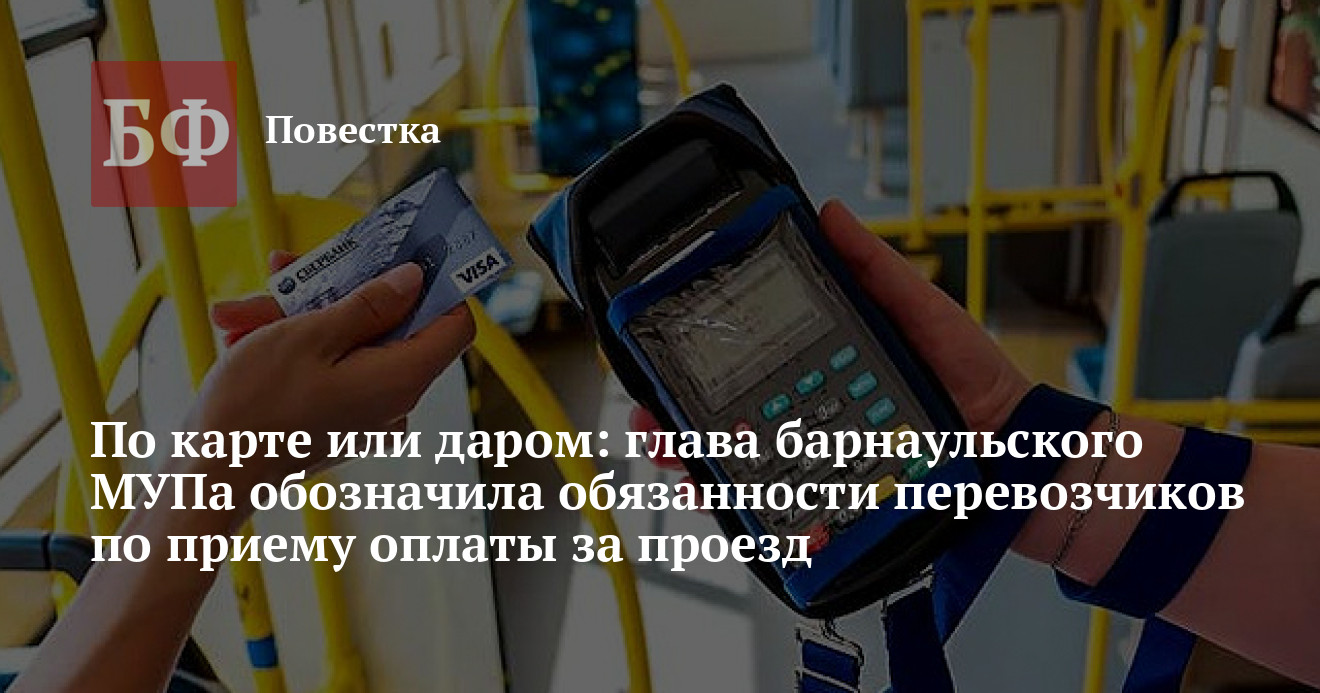 Большая часть пассажирского транспорта в Барнауле подключена к электронной системе оплаты и учета проезда и должна быть оборудована терминалами, чтобы граждане могли рассчитываться банковскими и транспортными картами. Если их нет там, где они быть обязаны, то поездка для пассажира будет бесплатной, заявила в эфире телеканала «Толк» руководитель МУП «Центртранс» Юлия Дорохова. В список подключенных к системе направлений, опубликованный на сайте МУПа, не входят единицы городских маршруток — только в них, по сути, могут потребовать рассчитаться наличкой или «по-барнаульски», переводом на карту водителю. В то же время в реальности горожане регулярно жалуются на проблемы с оплатой.
