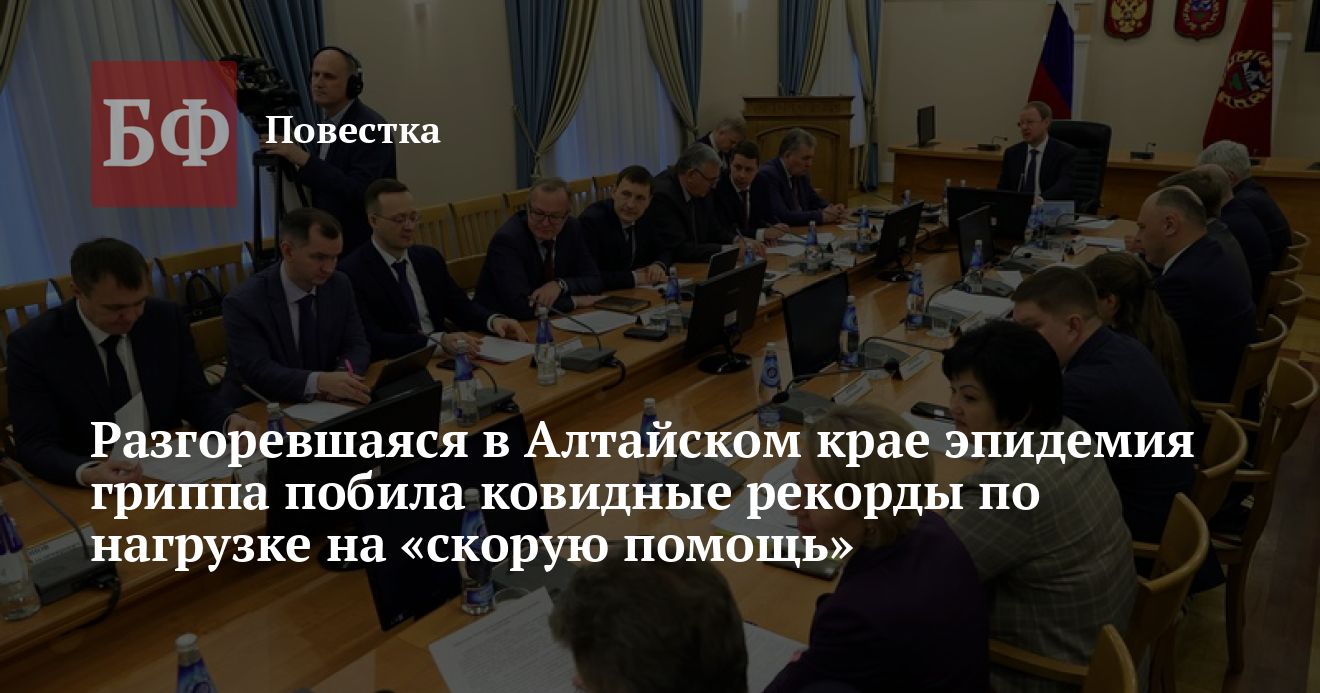 В Алтайском крае за последнюю неделю заболеваемость гриппом и ОРВИ увеличились более чем в два раза, эпидпорог превышен двухкратно. Как заявил министр здравоохранения региона Дмитрий Попов на совещании в краевом правительстве, сейчас «скорая помощь» в крае принимает около 3800 вызовов в сутки, что даже больше, чем в пик заболеваемости ковидом в 2020 году. Согласно эпидпрогнозу, рост заболеваемости будет продолжаться еще пару недель. Никаких ограничений власти вводить пока не планируют, сообщает правительственная пресс-служба.
