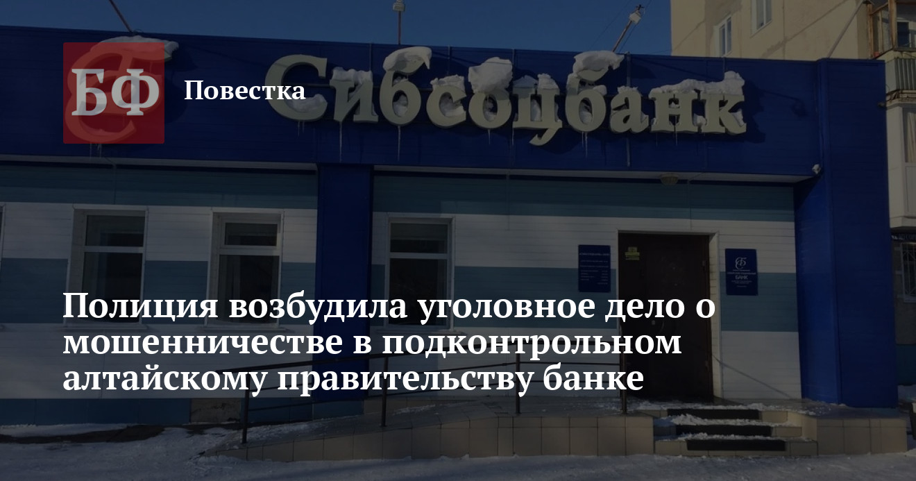Следственное управление МУ МВД России «Бийское» возбудило уголовное дело по признакам мошенничества, произошедшего в стенах филиала подконтрольного региональному правительству «Сибсоцбанка». Об этом сообщают источники ИА «Банкфакс». По имеющимся данным, речь идет о хищении около 7,4 млн рублей. Агентство направило запрос в ГУ МВД России по Алтайскому краю, чтобы подтвердить информацию.