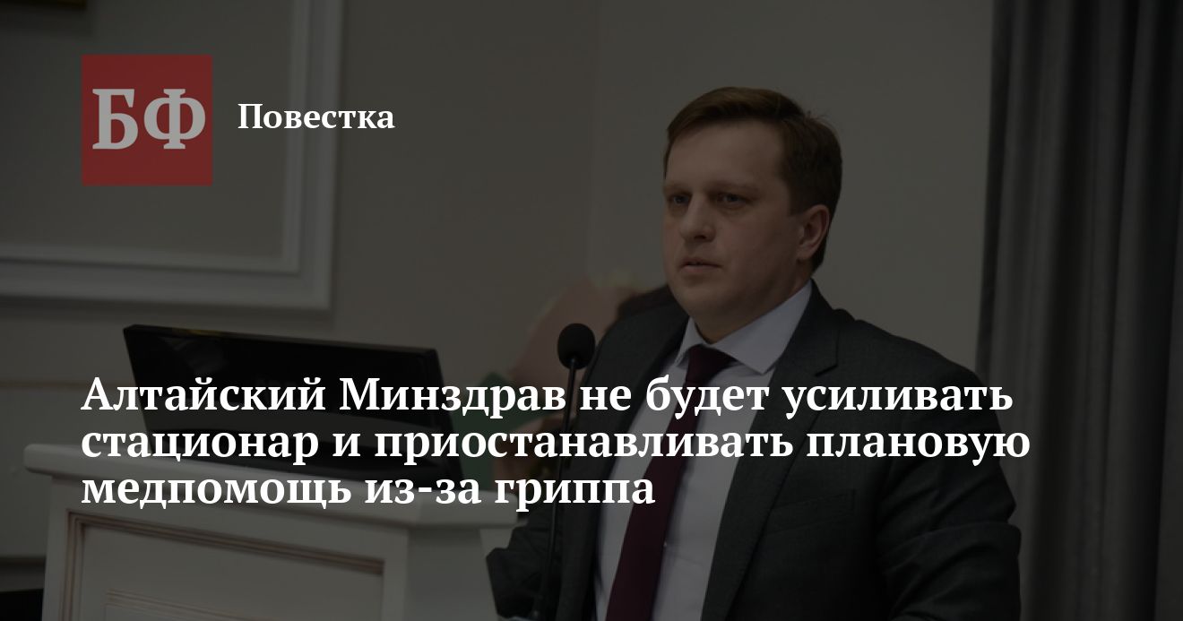 Несмотря на рост заболеваемости гриппом, в Алтайском крае не планируют перепрофилировать мощности стационара. Об этом заявил глава регионального Минздрава Дмитрий Попов во время онлайн-конференции 20 декабря. Также он отметил, что не видит необходимости в приостановке плановой медпомощи.