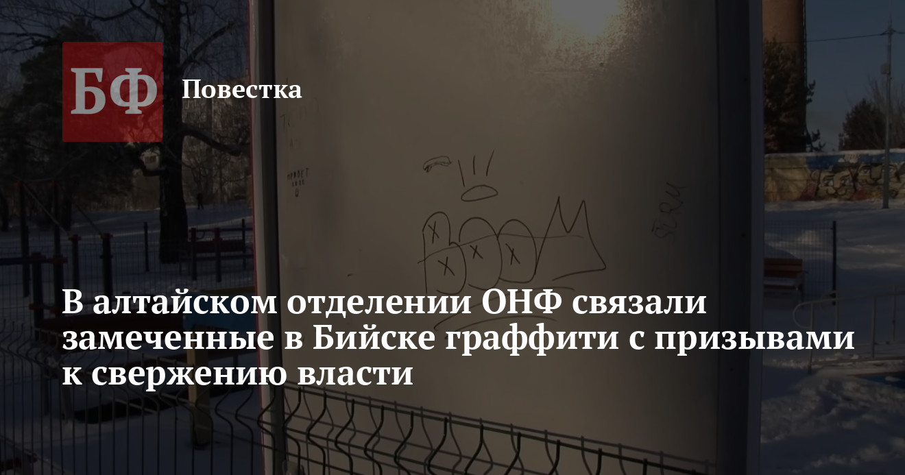 В Бийске члены алтайского регионального отделения Общероссийского народного фронта (ОНФ) обнаружили граффити, которые якобы призывают к свержению власти. Как сообщил ИА «Банкфакс» представитель реготделения Вячеслав Пермяков, одно из таких изображений — ставшую популярной благодаря соцсети TikTok надпись BOOM — встретила его федеральная коллега Светлана Калинина еще в сентябре во время инспектирования сквера Льнокомбината. Рисунок на месте, хотя власти Бийска просили убрать его, рассказал «фронтовик». Отметим, что ИА «Банкфакс» не нашло в открытых источниках информации о связи того самого граффити с призывами к свержению власти.