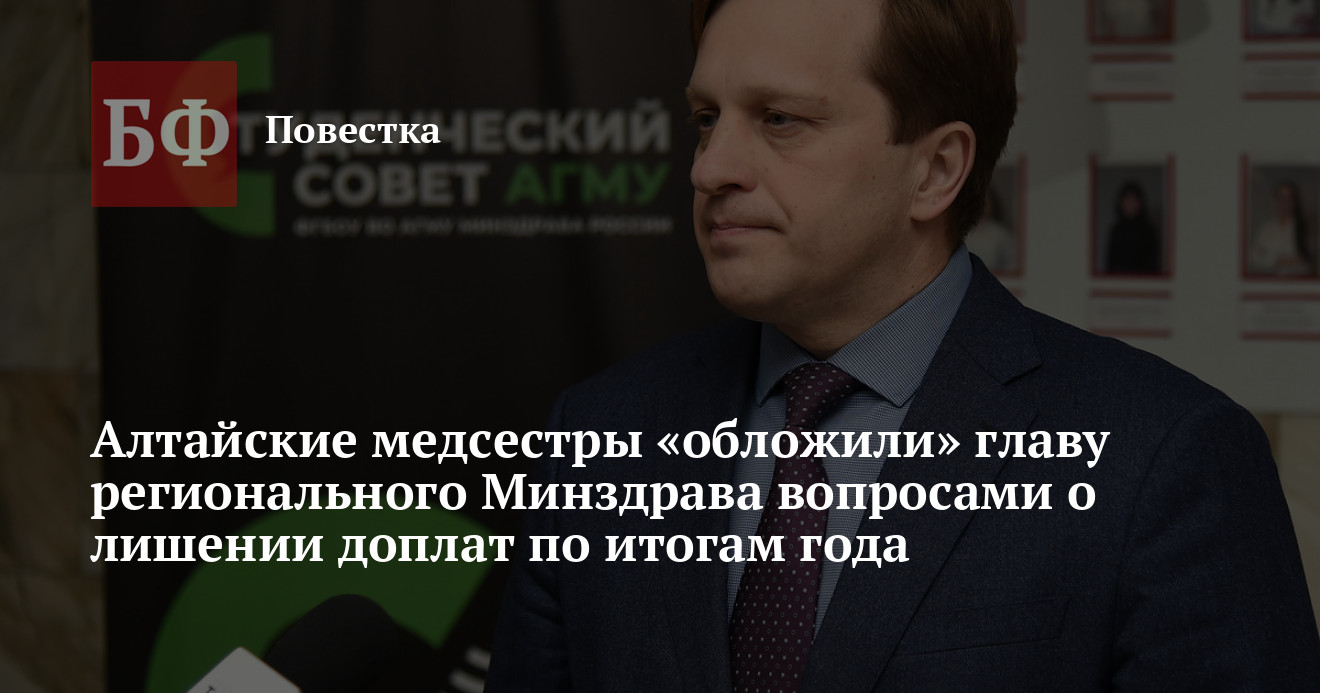 В Алтайском крае множество медсестер во время прямой линии с главой Минздрава региона Дмитрием Поповым 27 декабря задали ему вопросы касательно «премий по итогам года», которых их якобы лишают. Из ответов чиновника следует, что речь идет о федеральных доплатах категориям работников, в учреждениях которых в течение 11 месяцев не достигли показателей, обозначенных в «майском указе» президента Владимира Путина от 2012 года: зарплаты младшего и среднего медперсонала должны быть не ниже средней зарплаты по региону, а врачей — в два раза больше. По словам Попова, если в учреждении справились с задачей, то доплата не полагается. Между тем в КГБУЗ «Алтайский краевой кардиологический диспансер» ситуация с отсутствием доплат вызвала серьезные волнения, которые главврач Андрей Косоухов вовсе назвал «майданом». Медики пожаловались СМИ, и сейчас прокуратура проводит в диспансере проверку, пишет «Амител». После этого в Минздраве Алтайского края заявили, что доплату в регионе получит только врачи и младший медицинский персонал, а средний, к которому в том числе относятся медсестры, — нет.