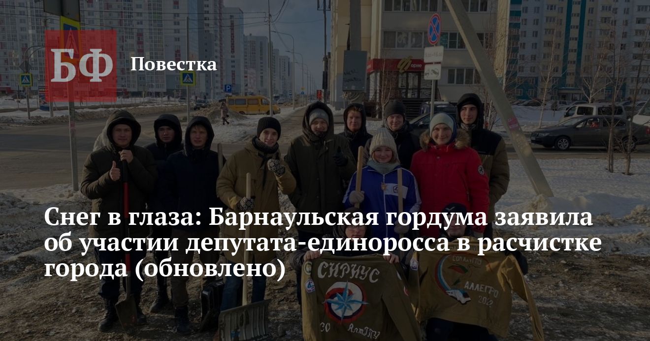 Барнаул пока еще не привели в порядок после оттепели и последовавшего за ней резкого похолодания, хотя по ГОСТу город уже должны были в основном очистить. Улицы продолжают освобождать от снега и наледи, в том числе привлекая к этим работам студентов. В то же время пресс-служба Барнаульской гордумы пишет, что к уборке подключаются и депутаты. В частности Сергей Струченко якобы «принял участие» в расчистке снега в Индустриальном районе Барнаула. Депутат рассказывает, что от горожан поступает много вопросов по уборке дворов. «По жилищному законодательству уборку проводят УК и ТСЖ. Особое внимание уделяется подъездам к социальным объектам, например, расчистка велась на подъездных путях к подстанции „скорой помощи“ „Урожайная 2“, по адресу Попова, 67 „А“. Кроме того, силы брошены на уборку снега на остановочных павильонах, расчистку тротуаров общественных территорий (здесь разбираться должны городские власти — прим. ред. ИА „Банкфакс“). Не остаются без внимания обращения граждан, которые указывают адреса, где необходима повторная очистка улиц», — рассказал Струченко.