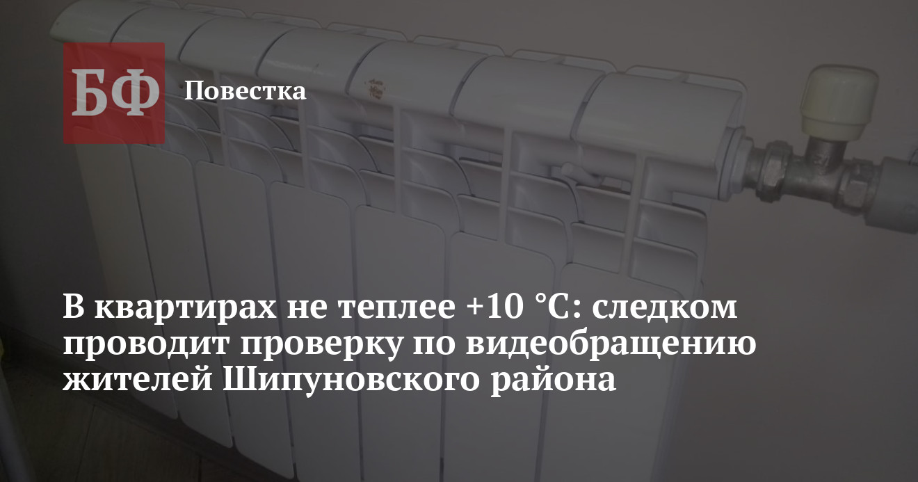 Следком начал проверку в связи с публикацией в СМИ видеообращения жителей многоквартирных домов Шипуновского района. По информации ведомства, граждане утверждают, что в некоторых помещениях температура не поднимается выше +10 °С. Такое происходит несмотря на то, что в районе ввели в эксплуатацию дорогостоящую модульную котельную и заменили трубы на теплотрассе. На все запросы в государственную жилищную инспекцию жители домов якобы получают формальные ответы.