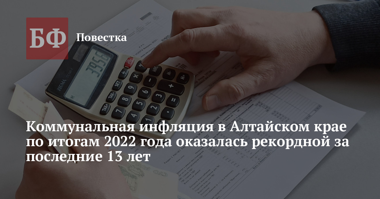 Годовая инфляция в Алтайском крае по результатам минувшего года составила 12,05%. Согласно публикации барнаульского отделения Банка России, коммунальные услуги по итогам декабря подорожали на 13,71% в годовом выражении. Согласно данным Росстата, это рекордное значение за последние 13 лет: сильнее ЖКУ выросли в цене в последний раз в 2009 году.