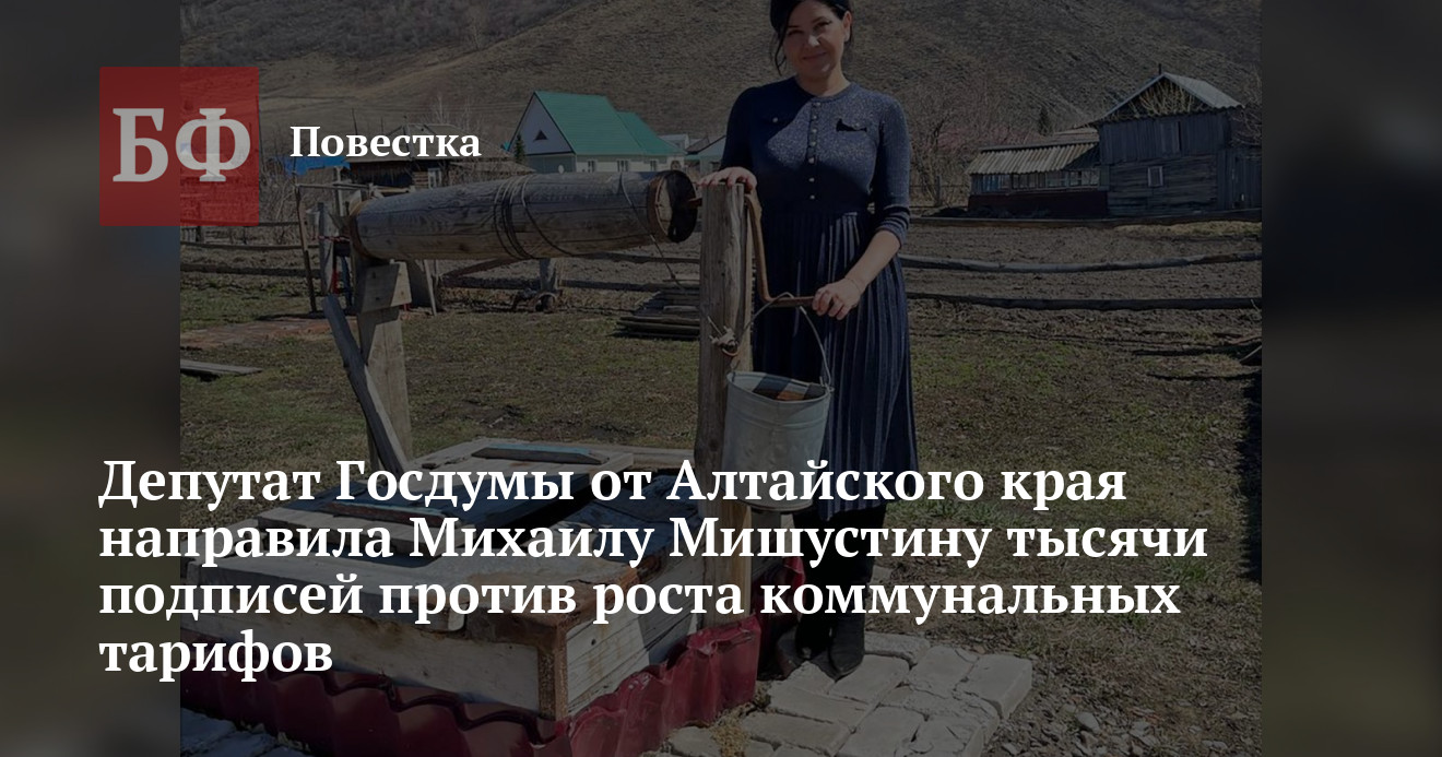 Депутат Госдумы от Алтайского края Мария Прусакова направила председателю правительства РФ Михаилу Мишустину подписи граждан, выступающих против повышения тарифов на ЖКУ, а также цен на уголь и топливо. Копию письма коммунистка опубликовала в своем Telegram-канале. Она просит премьера разобраться в обоснованности такого роста тарифов и изменить подход к максимальным индексам изменения платы.