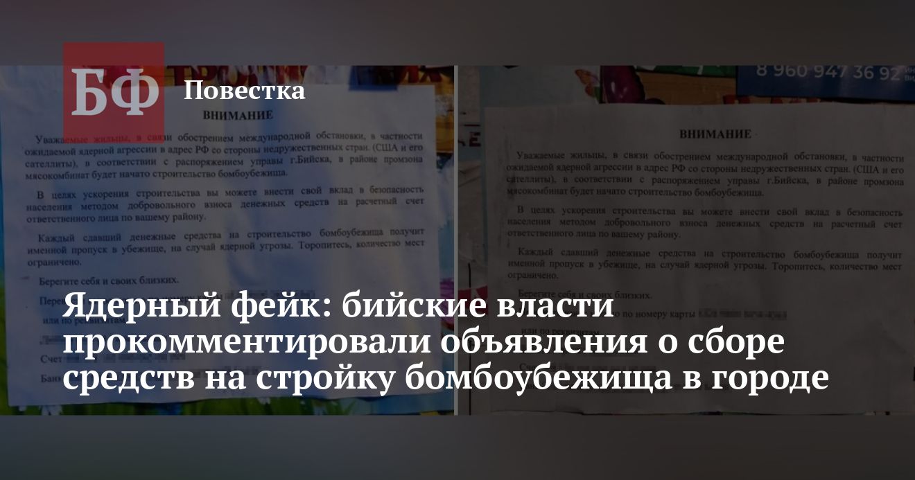Ранее бийчане рассказали агентству об объявлениях, которые стали появляться в городе. В них горожанам сообщают, что, будто бы по распоряжению главы наукограда, в районе мясокомбината будут строить бомбоубежище. «В целях ускорения строительства вы можете внести свой вклад в безопасность населения методом добровольного взноса денежных средств на расчетный счет ответственного лица по вашему району», — указано в объявлении. Каждому внесшему деньги неизвестные гарантируют именной пропуск в убежище на случай ядерной угрозы. Мошенники также призывают потенциальных инвесторов поторопиться, поскольку количество мест в объекте якобы будет ограничено. В листовке есть и банковские реквизиты некоего Сергея Дайбова — туда предлагается сделать перевод. Пользователи соцсетей припоминают некоего юриста с таким именем, который как раз жил в районе мясокомбината.