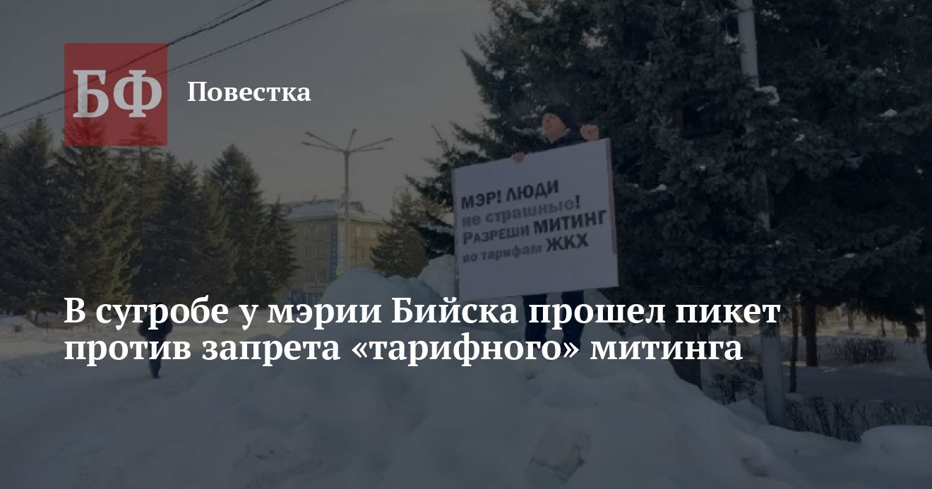 Персек бийского горкома КПРФ Владимир Балахнин провел одиночный пикет после того, как администрация города дважды отказалась согласовать митинг против роста тарифов на ЖКУ на Петровском бульваре. Как сообщил Telegram-канал «Левый Бийск», активист решил устроить одиночную акцию в сугробе возле мэрии. Также он подал очередной судебный иск, чтобы оспорить второй отказ властей в проведении большого схода граждан.