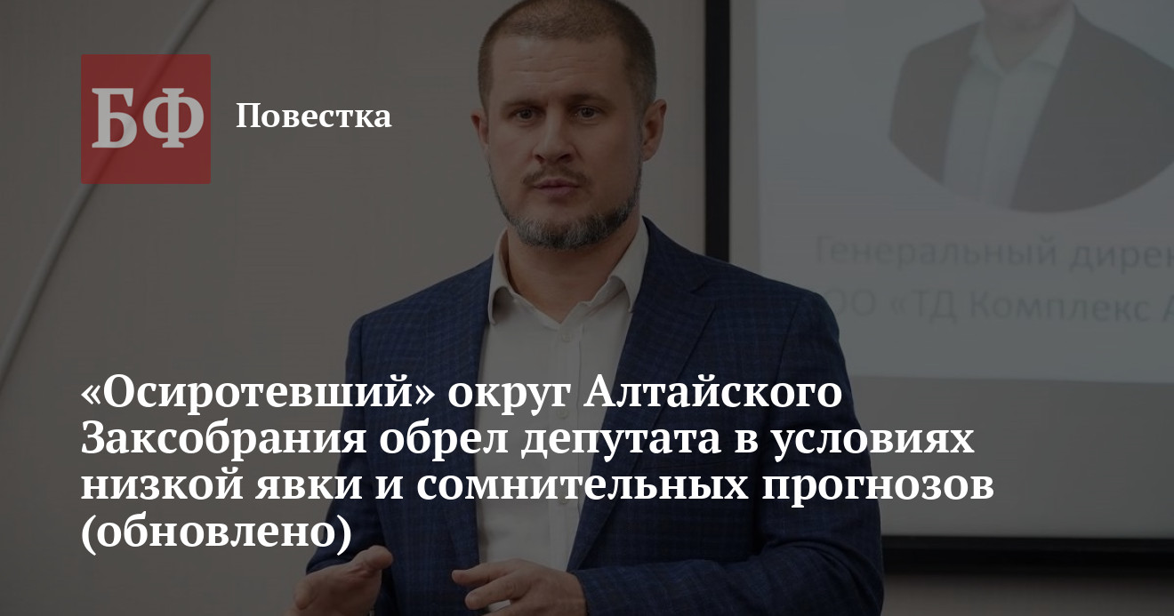 Кандидат от партии «Единая Россия», гендиректор компании «Комплекс Агро» Дмитрий Беляев одержал победу на довыборах по округу № 5 Алтайского Заксобрания. Как следует из информации ГАС «Выборы», от ближайших конкурентов он оторвался на 3,5 тысячи голосов. Однако избрание произошло в условиях крайне низкой явки. Граждане в процентном соотношении проявили куда больше интереса к выборам главы одного из сельсоветов на округе, чем краевого депутата. Процесс голосования омрачился и преждевременной публикацией экзитполов командой местного политтехнолога Константина Лукина, который не увидел в этой ситуации большой проблемы. В истории будет разбираться избирком.