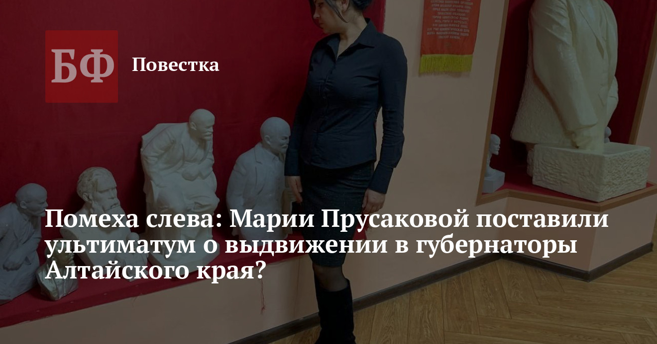 Левые силы вступили в открытую конфронтацию в преддверии выдвижения кандидатов на пост губернатора Алтайского края. Обсуждаемое противостояние депутатов Госдумы Марии Прусаковой и Анжелики Глазковой подтвердилось заявлением, опубликованным в Telegram-канале лидера движения «За новый социализм» (ЗНС), Николая Платошкина, приходящегося Глазковой супругом. В нем утверждается, что ЗНС не будет поддерживать Прусакову, если она станет выдвиженкой без согласования с другими левыми. Вероятно, сторонники Платошкина видят возможным кандидатом Глазкову, хотя пока это напрямую не обозначается.