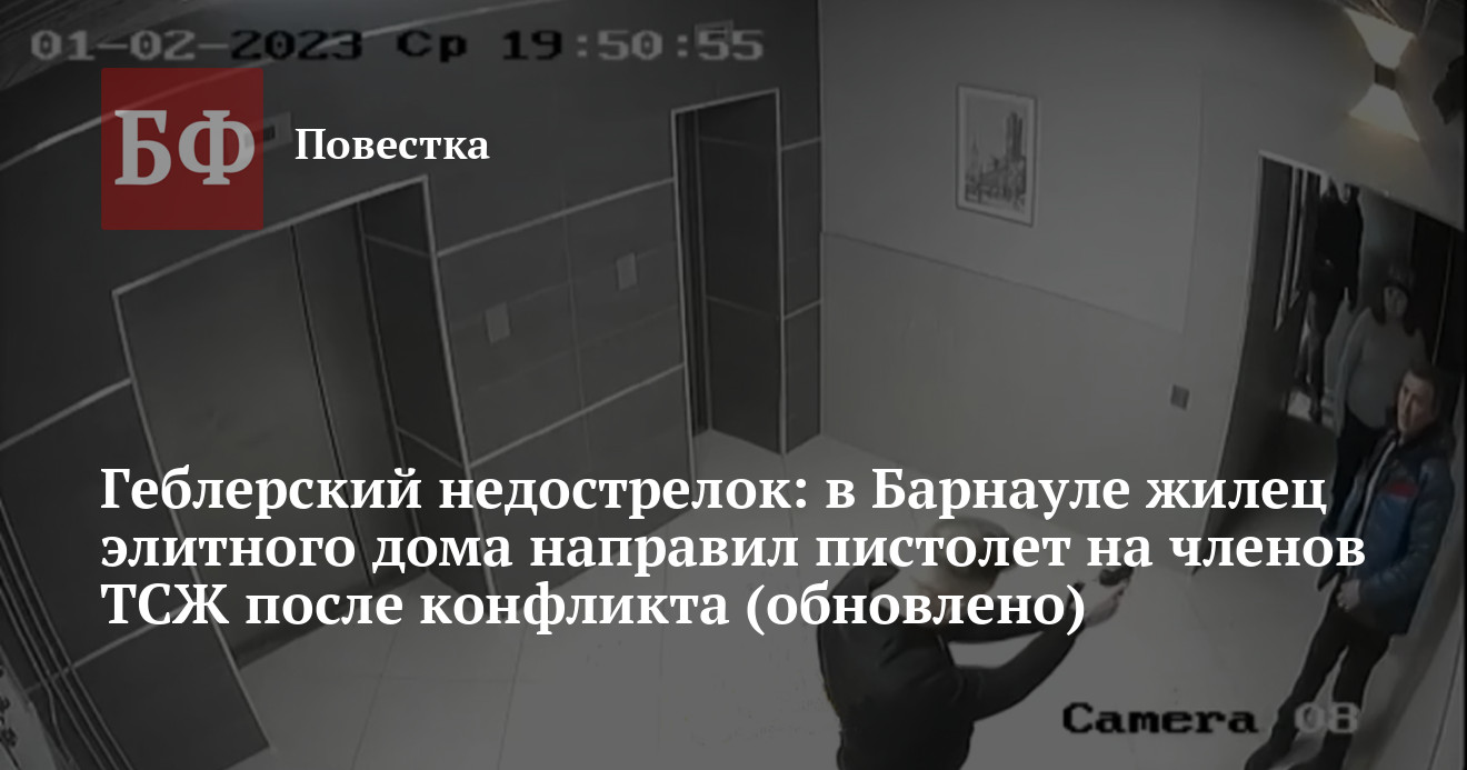 В Сети обсуждается конфликт, разгоревшийся между работниками действующей в одном из элитных домов управляющей организации и жильцом, который якобы является сыном известного в Барнауле предпринимателя. Обеспокоенные тем, что ситуацию «замнут», граждане предоставили видеозапись с камеры наблюдения, на которой видно, среди прочего, как молодой человек направил пистолет на оппонентов. В пресс-службе ГУ МВД России по Алтайскому краю сообщили ИА «Банкфакс», что по данному случаю им поступило заявление, но по факту побоев, и по нему проводится проверка. Между тем граждане пишут, что сообщали также об угрозе жизни. Как выяснила редакция, события происходили в доме на переулке Геблера, 31. Фамилия несостоявшегося стрелка до настоящего времени не раскрывается.