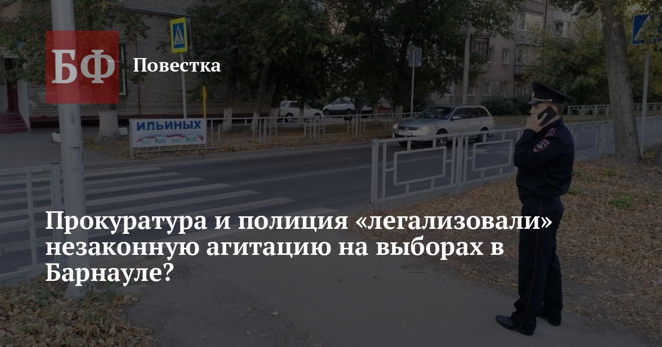 Как сообщалось ранее, незадолго до и непосредственно в дни голосования в Барнауле стали появляться плакаты с наименованием «Единой России» и ее кандидатов без выходных данных, но с партийной символикой. Многие горожане обратили внимание на ситуацию и посчитали размещение неправомерным, некоторые прямо указывали на нарушение норм федерального законодательства, а в соцсетях появилось множество фотосвидетельств. Центральная районная территориальная избирательная комиссия Барнаула проверила некоторые баннеры и установила на них признаки агитации. Данные были переданы в полицию для проведения проверки. Но в краевом ГУ МВД заявили, что нарушение не подтвердилось, причем в качестве обоснования использовался весьма странный аргумент: агитационные материалы размещались в разрешенные сроки.
