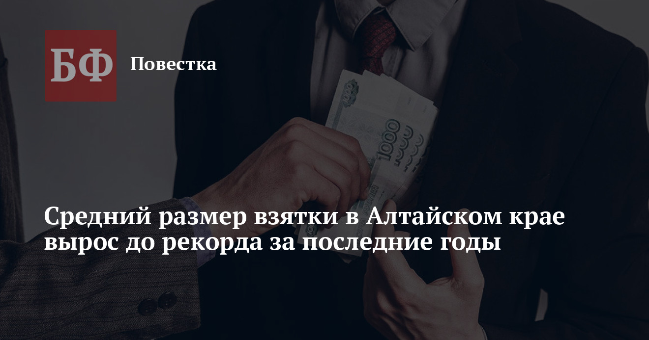 Прокуратура Алтайского края выявила рекордный рост средней суммы взятки в 2022 году — зафиксировано наибольшее значение с 2019 года. Об этом сообщает «ФедералПресс» со ссылкой на исполняющего обязанности начальника отдела по надзору за исполнением законодательства о противодействии коррупции надзорного ведомства Андрея Курганова.