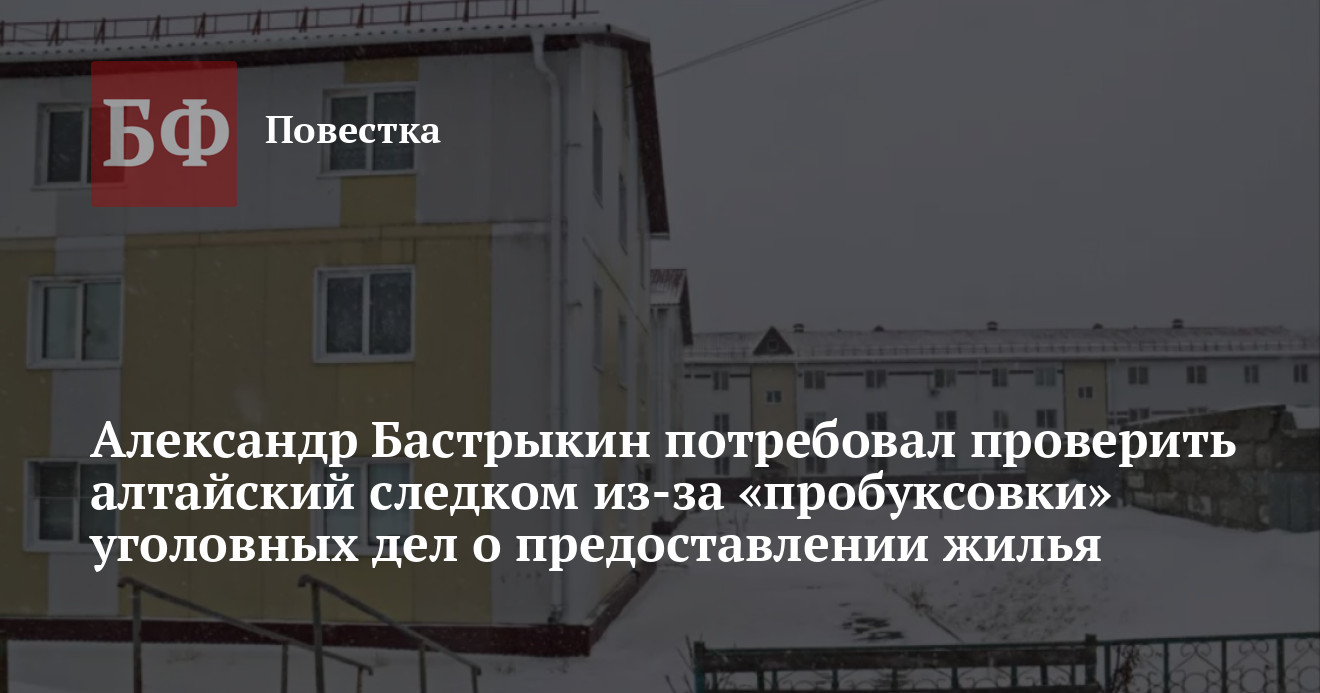 Председатель Следственного комитета России Александр Бастрыкин дал указание провести служебную проверку в отношении алтайского подразделения ведомства, сообщает пресс-служба федерального Следкома. Причиной для этого стало его недовольство работой краевых следователей при расследовании уголовных дел, связанных с переселением граждан из аварийного и некачественного жилья — в том числе, судя по информации ведомства, из «спековских» домов в Бийске. Бастрыкин раскритиковал своих коллег из Алтайского края из-за допущенной волокиты. Ранее уже неоднократно сообщалось, что качество жилья для переселенцев на Спекова оказалось ужасным, но с 2012 года подвижек в ситуации почти нет. До сих пор мэрия Бийска не может предоставить гражданам нормальные помещения, а следственные органы - привлечь к ответственности виновников.