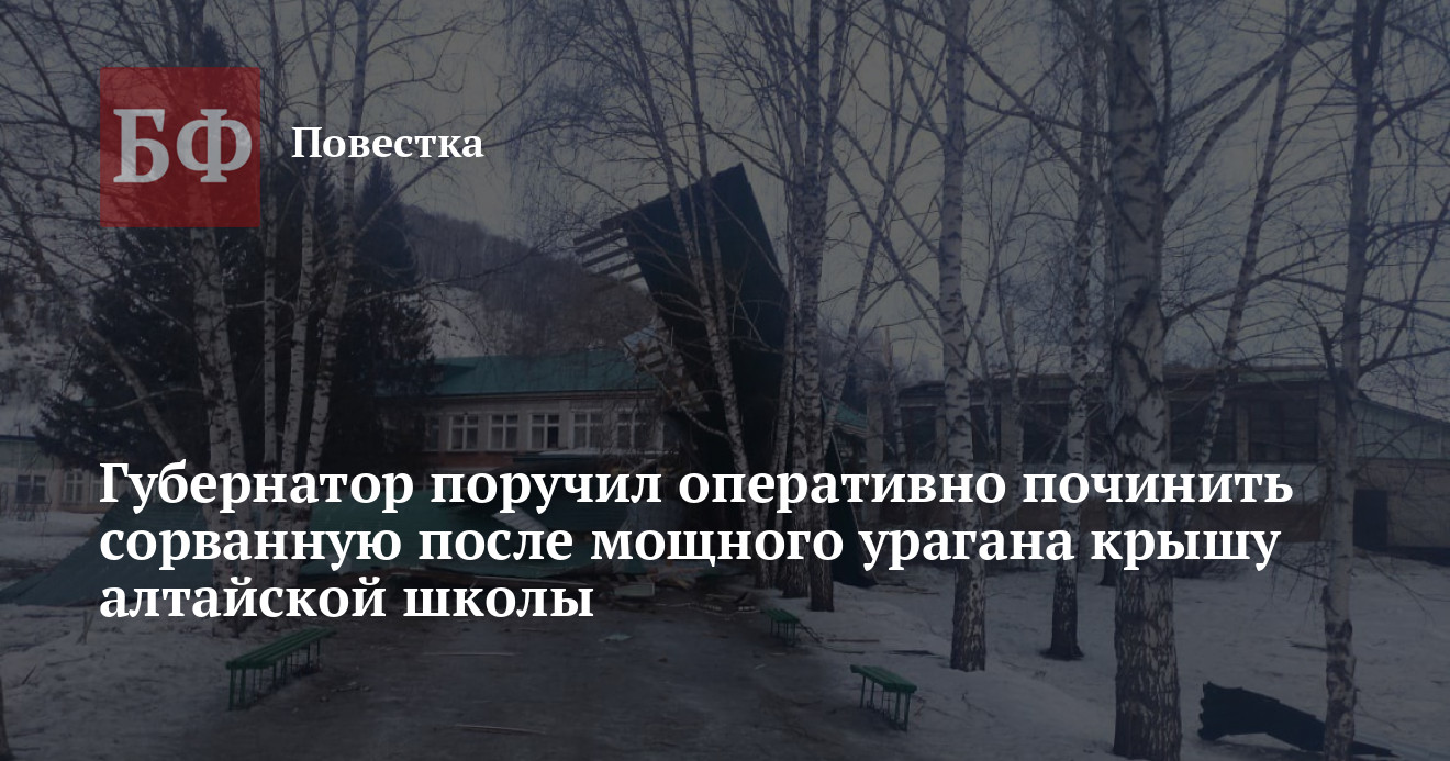 В Алтайском крае в ту же ночь ветром сорвало кровлю со здания школы в Ае на общей площади около 400 кв. м — село располагается в предгорной части, на которую пришелся основной удар стихии. Без крыши остались спортивный и актовый залы, а также столовая. Как сообщил глава Алтайского района Виктор Тырышкин, несмотря на повреждения, с понедельника в образовательном учреждении должны были начаться занятия. Якобы работы по ремонту кровли не должны помешать урокам. Виктор Томенко поручил Министерству образования и науки края и районной администрации в кратчайшие сроки провести ремонтные работы. Оперативно уточнить, когда местные власти приступят к работе, в райадминистрации «Банкфаксу» не смогли.