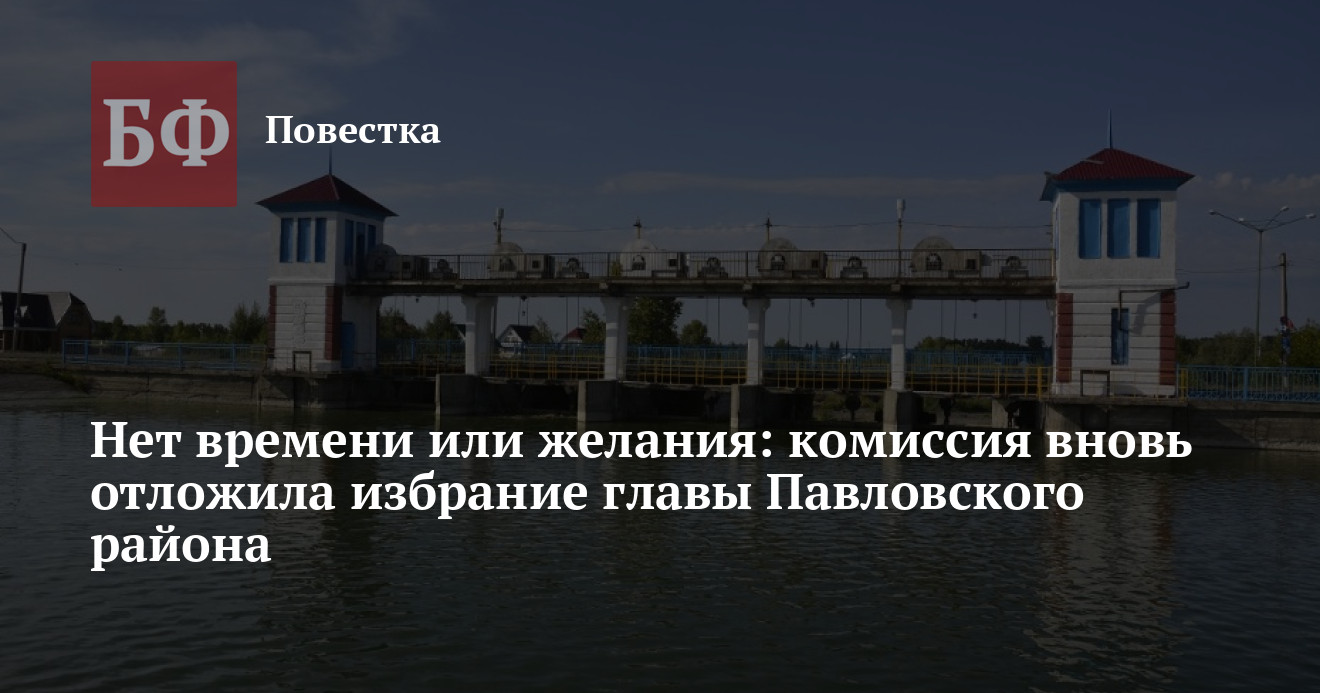 Ранее предполагалось, что 10 марта подойдет к концу затянувшаяся история с избранием главы Павловского района. Как стало известно «Банкфаксу» заседание конкурсной комиссии по отбору кандидатов в итоге отложили, из-за чего вопрос с допуском участников до голосования депутатов до сих пор не решен. Один из членов жюри, спикер Алтайского Заксобрания Денис Голобородько сообщил редакции, что это произошло из-за нехватки времени на рассмотрение всех запланированных вопросов. По другой версии, представители губернатора в комиссии отказались принимать решение. В любом случае, из-за действий или бездействия делегатов, период безглавия в районе продолжается.