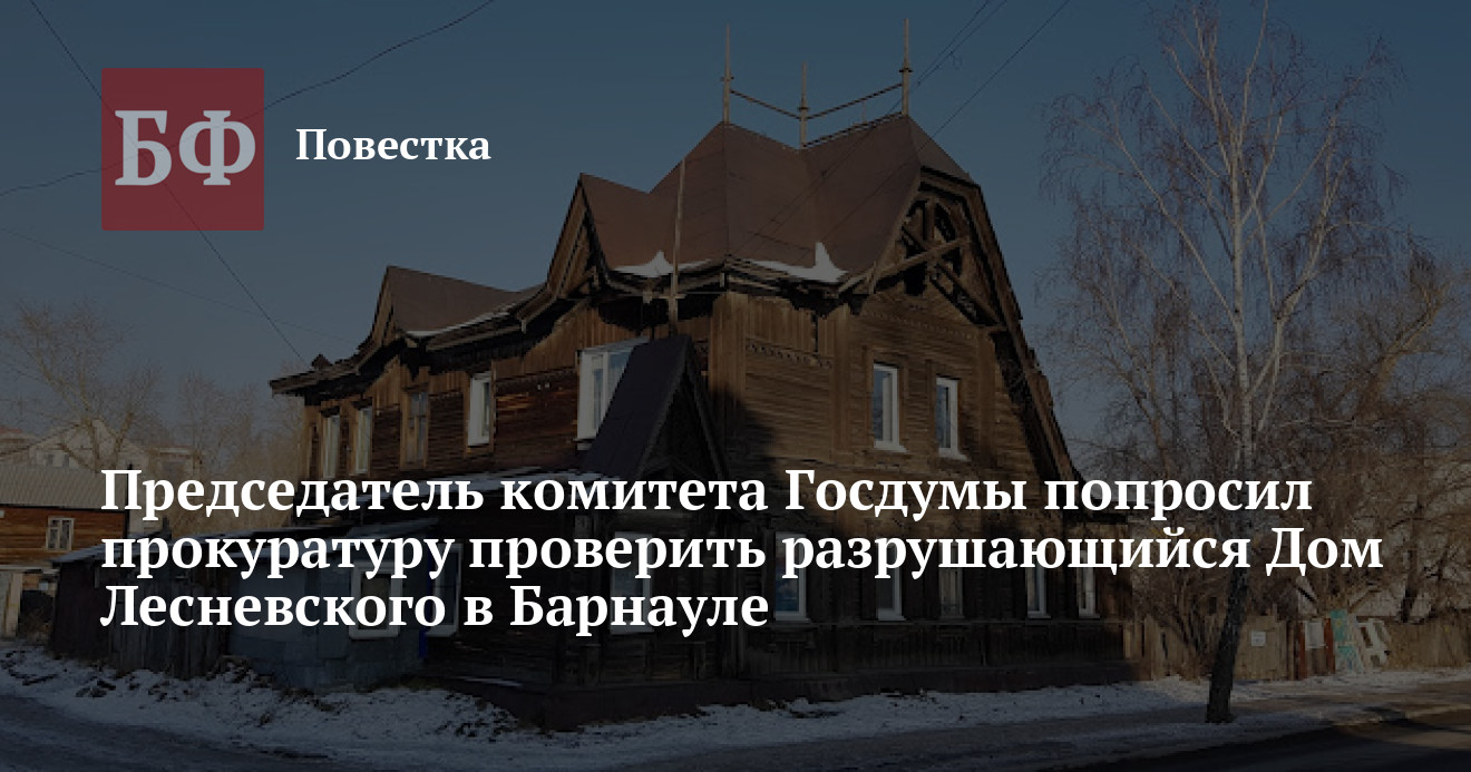 15 марта председатель информационного комитета Госдумы и координатор проекта «Историческая память» партии «Единая Россия» Александр Хинштейн направил обращение прокурору Алтайского края Антону Герману. Как пояснил ИА «Банкфакс» советник политика Сергей Пименов, повод для этого дала публикация ИА «Банкфакс» о Доме Лесневского. В ней сообщалось о том, что за период расселения дома, длящийся уже два года, его состояние значительно ухудшилось, и дошло до обрушения крыши. После того, как здание опустеет, администрация Барнаула обещала провести реставрацию. При этом никаких мер для замедления разрушительных процессов, пока дом еще остается жилым, мэрия не предпринимает. Кроме того, «Банкфакс» описал споры между чиновниками и гражданами, из-за которых в аварийном строении продолжают жить две семьи.