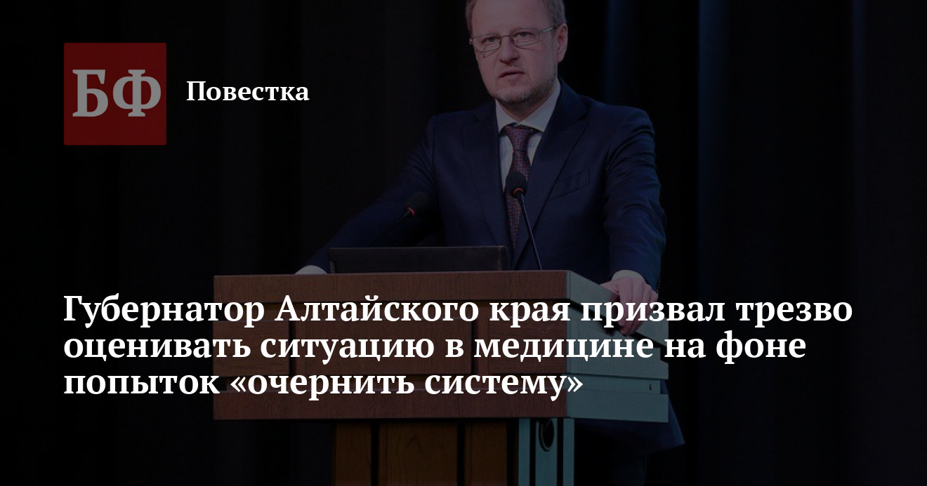 Открывая мероприятие, он решил высказаться о наветах, которые, по его мнению, возникают в дискуссиях о текущем положении медицины в регионе. Вероятно, он считает, что это связано с политикой и выборами губернатора в этом году. «Положение дел немного политизированное — этот год особенный для Алтайского края. Многие заинтересованные силы стараются использовать ситуацию, чтобы очернить систему, побороться за свои выгодные позиции. Мы это должны понимать. Поэтому общую ситуацию мы должны оценивать объективно, трезво. Но, естественно, не приукрашивая реальность — такой задачи нет. Но и голову посыпать пеплом, и прятаться от каждого возгласа, продуманного или нет, тоже неправильно», — заявил глава. Конкретные примеры попыток очернения в сообщении не приводятся.
