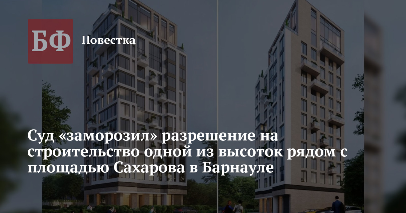 Центральный районный суд Барнаула удовлетворил требование группы жильцов двух пятиэтажек на улице Молодежной № 21 и № 23, которые просили приостановить действие приказа профильного комитета горадминистрации о выдаче разрешения на строительство 14-этажного дома у площади Сахарова по соседству с ними. Как следует из постановления (копия есть в распоряжении редакции ИА «Банкфакс»), приказ будет заморожен до конца разбирательства, в рамках которого люди добиваются полной отмены разрешения на строительство.