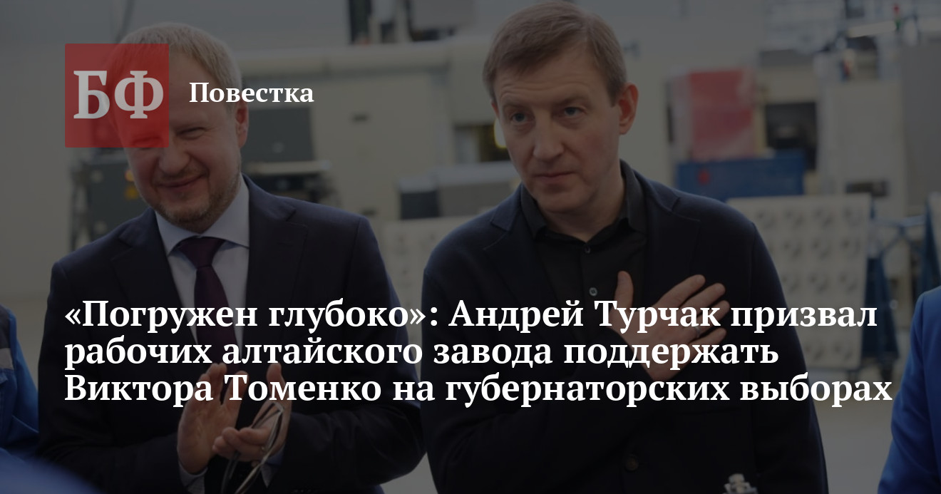 В завершение встречи секретарь Генсовета «Единой России» обратился к работникам АЗПИ с политическим призывом, касающимся грядущих губернаторских выборов. «У меня убедительная просьба. Выборы еще не начались, но они состоятся в Алтайском крае. Поддержите нашего коллегу Виктора Петровича [Томенко]. Мы его точно поддержим, потому что [положительные] изменения за этот пятилетний цикл произошли. Я здесь с определенной периодичностью бываю и не только в Барнауле. Реально меняется картинка. Сообща плечом к плечу мы выстоим и этот тяжелый период обязательно. Экономика Алтайского края будет развиваться и ваше производство», — подытожил Андрей Турчак выступление перед заводчанами, фактически дав неофициальный старт предстоящей предвыборной кампании Виктора Томенко.