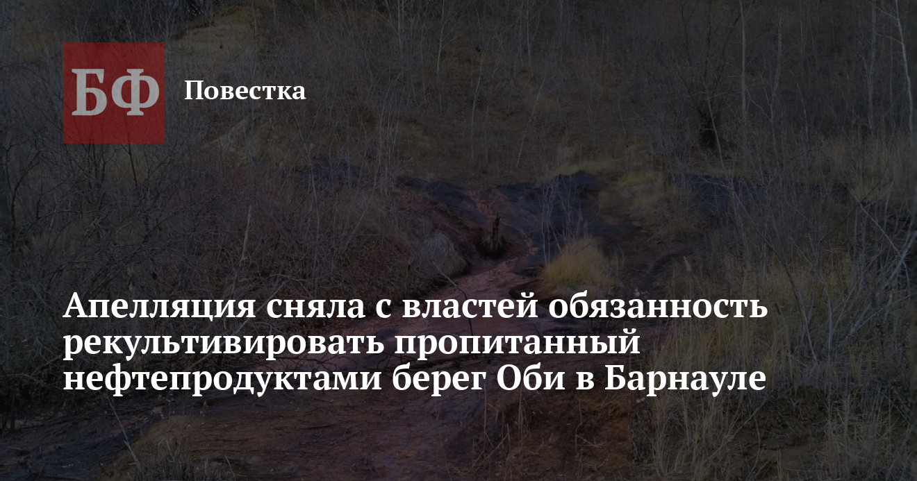 В начале ноября прошлого года Центральный районный суд Барнаула обязал Управление имущественных отношений Алтайского края и МТУ Росимущества в Алтайском крае и Республике Алтай рекультивировать загрязненный нефтепродуктами берег Оби в районе барнаульского Ковша. В Алтайкрайимуществе, еще даже не получив решение на руки, заявили о намерении его обжаловать. Позже об аналогичных планах сообщили и в Росимуществе. Чиновники из краевого Управления объясняли, что не снимают с себя ответственности за сложившуюся ситуацию. Однако они полагали, что она лежит не только на них. По мнению ведомства, Центральный районный суд Барнаула не установил лиц, чья деятельность и привела к загрязнению участка, а просто возложил обязанность по рекультивации на формальных распорядителей.
