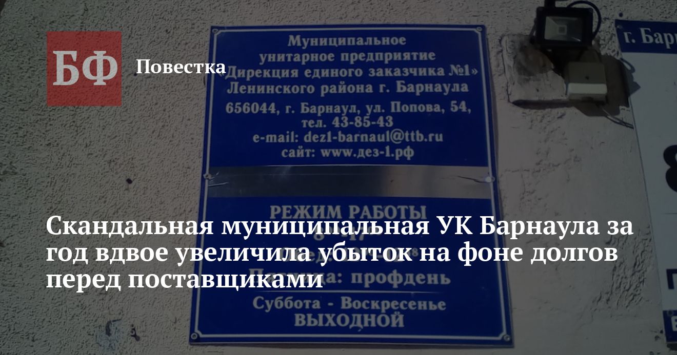 Убытки барнаульского МУП «ДЕЗ-1» Ленинского района по итогам 2022 года выросли почти вдвое по сравнению с предыдущим периодом. Соответствующая информация размещена в бухгалтерской отчетности на информационном ресурсе ФНС. При этом ресурсоснабжающие организации жалуются, что муниципальная организация еще и задолжала им крупную сумму.