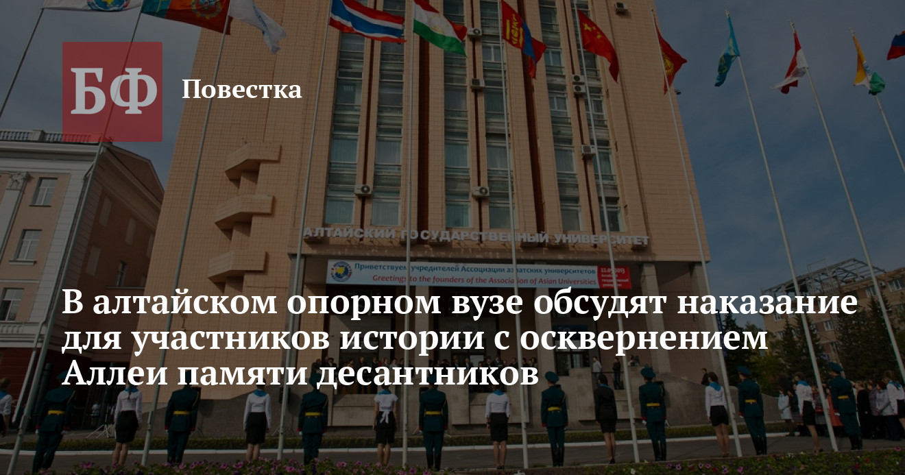 Никто из профессорско-преподавательского состава АлтГУ не будет привлечен к ответственности после громкого случая вандализма на Аллее памяти воинов-десантников в Барнауле, как того требовали правоохранители. Однако студентов, которые были очевидцами инцидента, похоже, все же ждет «дисциплинарка». Как следует из ответа университета на запрос «Банкфакса», заседание соответствующей комиссии намечено на середину мая.