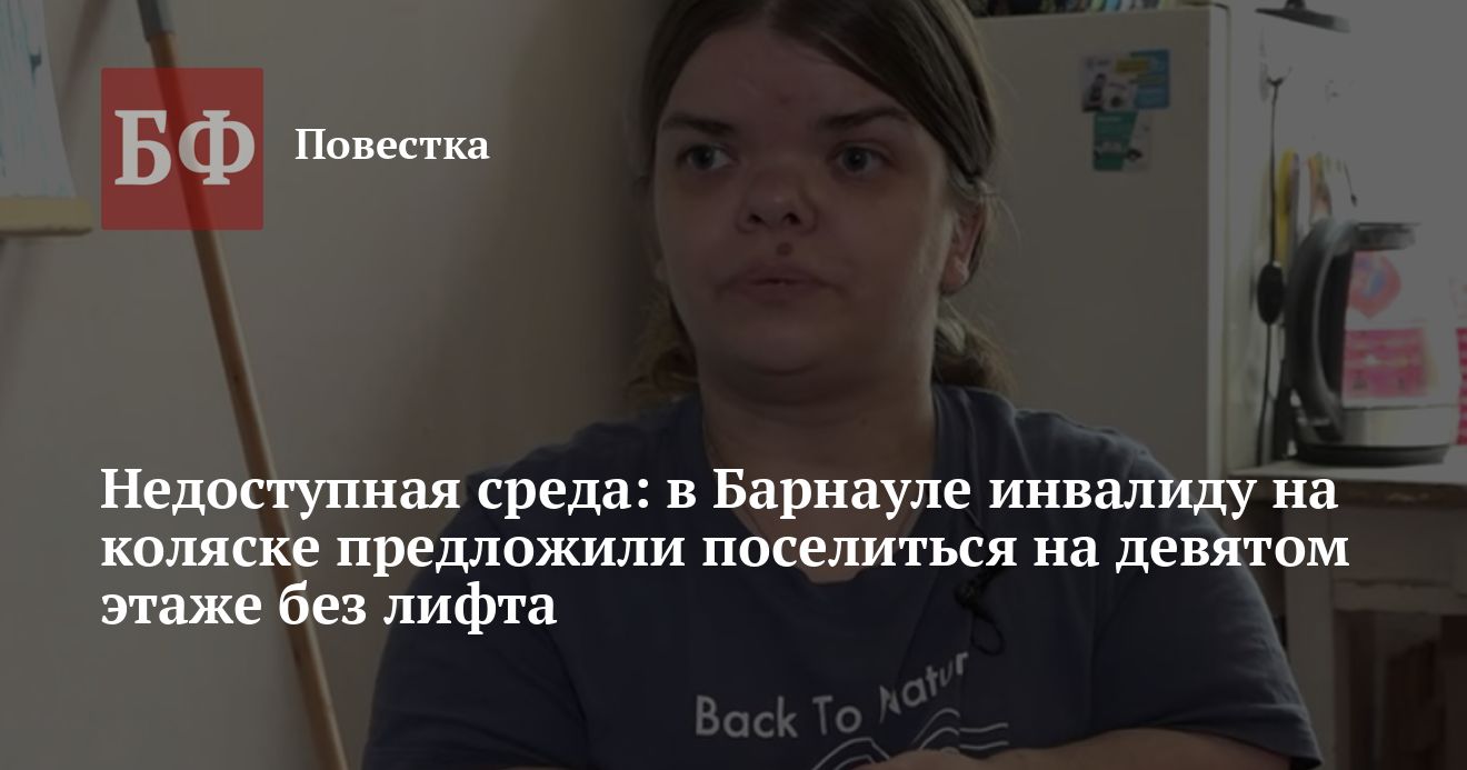 КГКУ «Региональное жилищное управление» (РЖУ), которое обязано обеспечивать алтайских сирот квартирами, предложило девушке с ограниченными возможностями здоровья поселиться на девятом этаже. Более того, лифт в доме, куда хотят определить сироту, ходит только до восьмого этажа. Подробности ситуации выяснял «Толк».