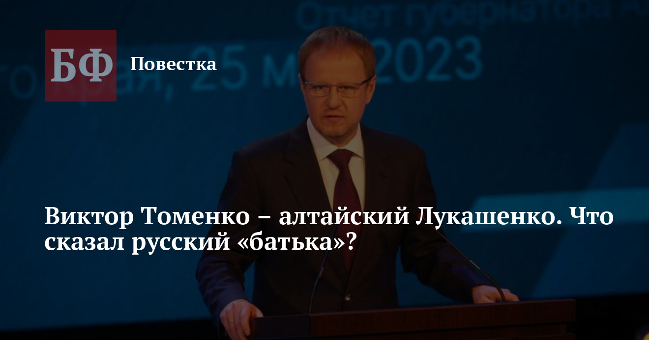 Глава Алтайского края Виктор Томенко выступил с докладом о своей работе в 2022 году, открыв очередную сессию регионального Заксобрания. Он уделил внимание большинству, по его мнению, ключевых аспектов социально-экономического развития региона, причем акцентировал внимание не только на отчетном периоде, но на и всей пятилетке своего губернаторства. Собеседники «Банкфакса» отметили, что в этот раз его речь была более эмоциональной и менее формалистской, а для некоторых он открылся в новом амплуа хозяйственника. Отдельные наблюдатели в политических кругах уже называют его «алтайским Лукашенко» и «русским батькой».