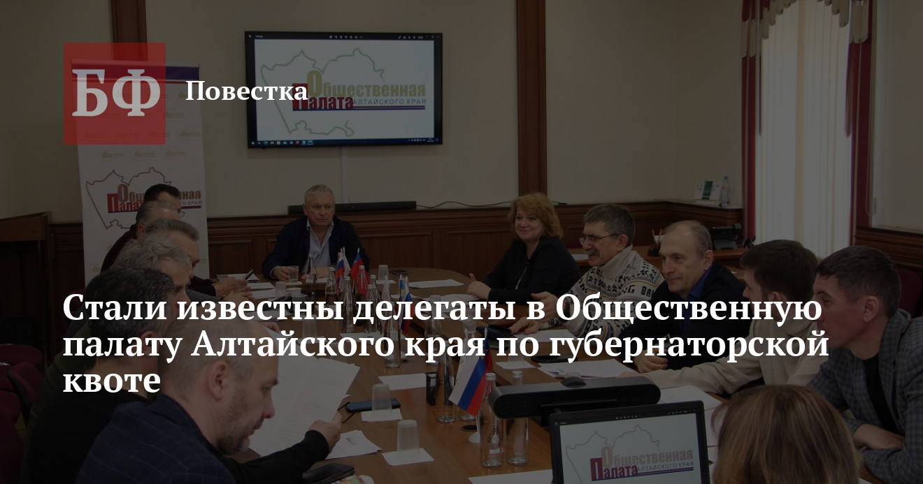 При этом накануне свою квоту закрыло Алтайское Заксобрание. На сессии депутаты также одобрили список из 15 общественников из организаций края. Восемь из них ранее не были в составе ОПАК: Игорь Волдачинский (Федерация корпоративного спорта Алтайского края), Вадим Коваленко (общественная организация «Объединение ветеранов казачьего движения и казаков — участников боевых действий»), Ирина Козлова (Фонд развития предпринимательства, внедрения инноваций и поддержки социальных инициатив «Содействие»), Роман Куранов (АНО «Юристы — населению»), Виктор Мещеряков (Союз промышленников Алтайского края), Артем Сингач (краевой фонд «Социальные инициативы»), Наталья Хан (Фонд Владимира Шаманова «Защитники Отечества»), Николай Якушев (общественная организация родителей детей-инвалидов, имеющих заболевания опорно-двигательного аппарата и ментальные нарушения «Дети-Ангелы»).