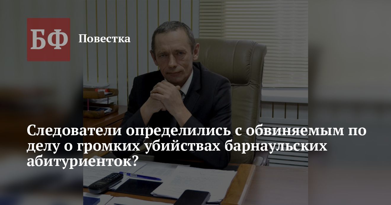 Обвинения в совершении серии громких убийств абитуриенток АлтГТУ им. И.И. Ползунова могли предъявить бывшему заместителю главы Калманского района Виталию Манишину, ранее сознавшемуся в другом убийстве более чем тридцатилетней давности. Об этом сообщают источники Telegram-канала Baza. Мужчина будто бы уже дал признательные показания.