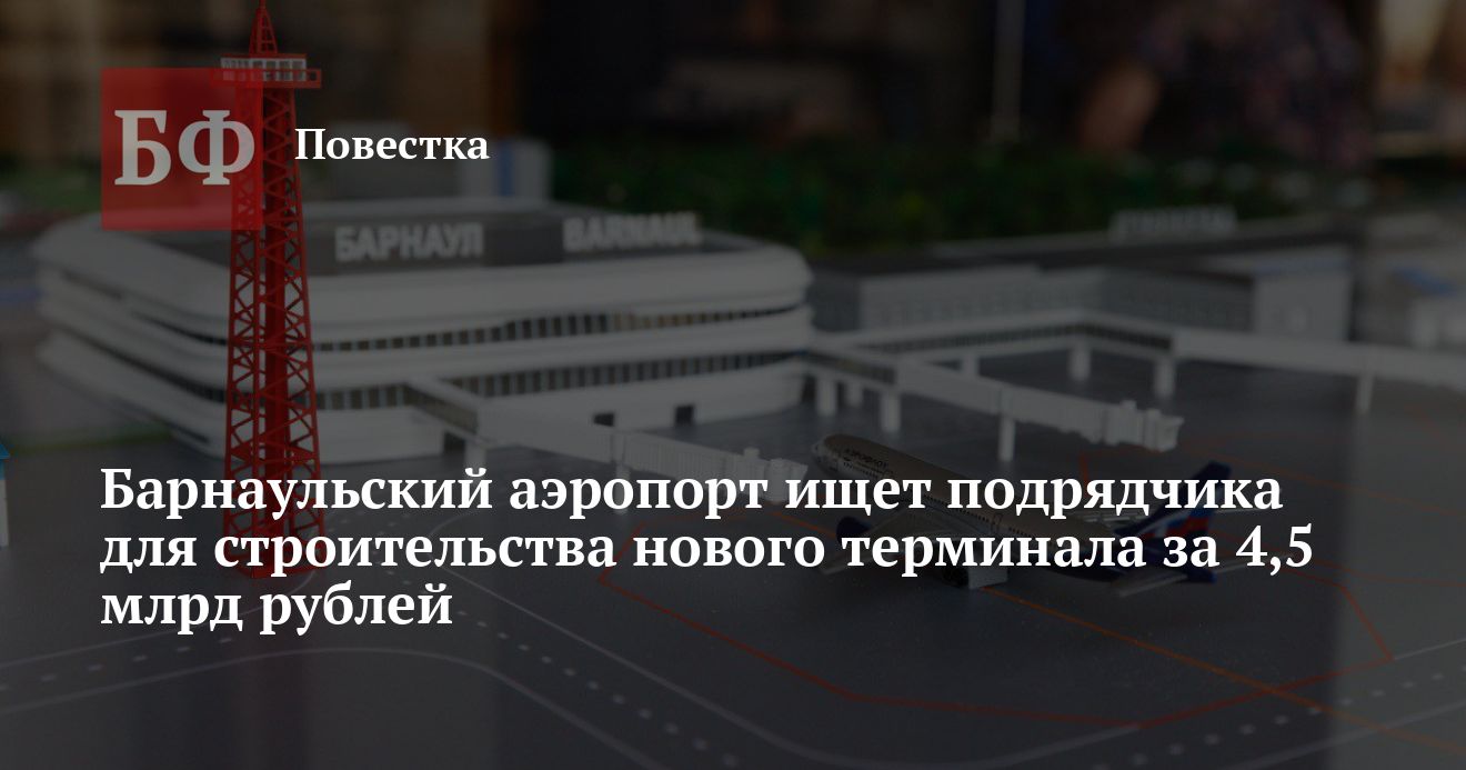 28 июня АО «Авиапредприятие «Алтай» объявило о поиске подрядной организации для возведения нового аэровокзального комплекса. Торги начнутся с цены в 4,505 млрд рублей. При этом отбор проведут в формате открытых переговоров. Заявки на участие в процедуре принимают до 16 августа, а итоги подведут 28 августа.