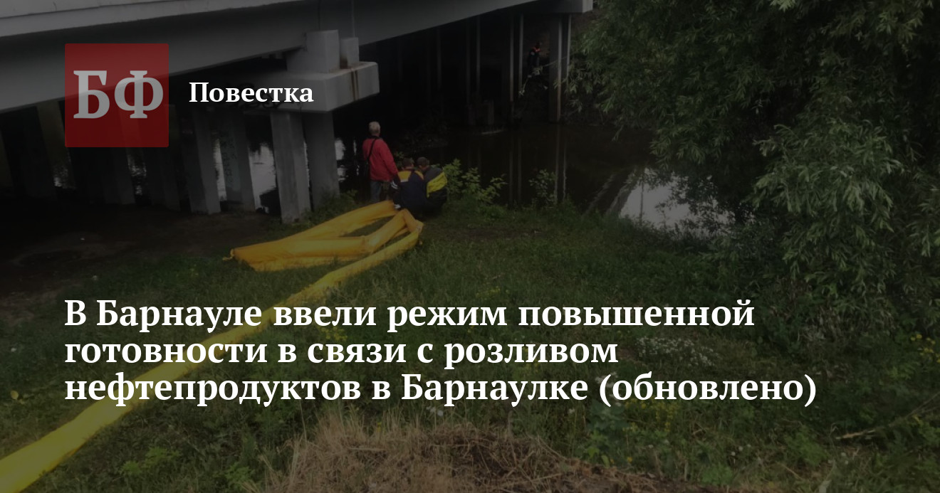 29 июня глава Центрального района Барнаула Максим Сабына подписал постановление о введении режима повышенной готовности по адресу Приречная, 9. Решение было принято по факту визуального обнаружения нефтепродуктов в Оби в прибрежной зоне этого дома. Отметим, что здесь Барнаулка впадает в Обь. Для обеспечения безопасности населения о предупреждении возникновения возможной чрезвычайной ситуации муниципальному управлению по делам ГОЧС рекомендовали обратиться в Центр лабораторного анализа и технических измерений по Алтайскому краю (ЦЛАТИ) для замера предельной концентрации нефтепродуктов в месте розлива.