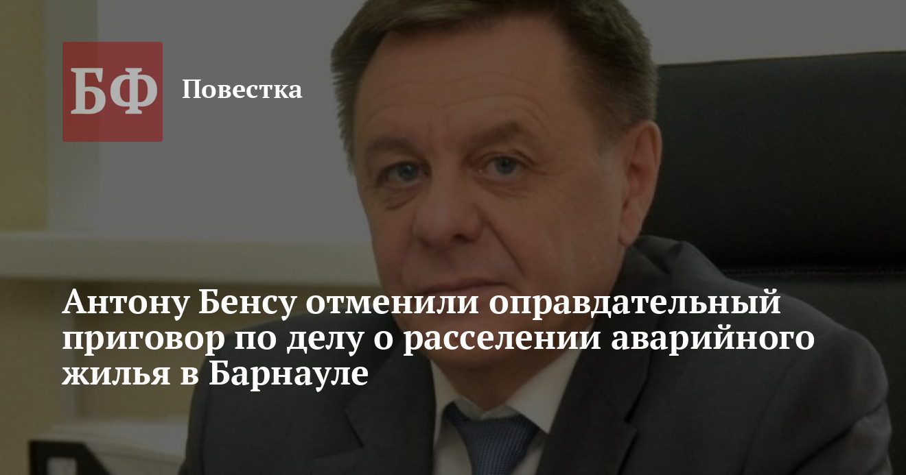 Бывшего главу комитета ЖКХ Барнаула Антона Бенса все же могут привлечь к уголовной ответственности по делу о расселении аварийного жилья. В пресс-службе Алтайского краевого суда «Банкфаксу» сообщили, что его оправдательный приговор отменили.