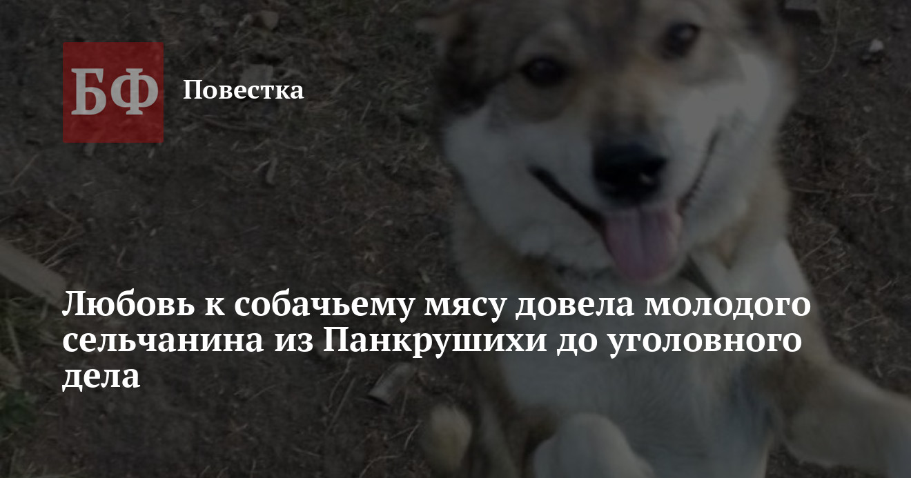 30 июня в социальных сетях и мессенджерах стала распространяться переписка с видеосообщениями жителей райцентра Панкрушиха. В ней некий молодой человек по имени Алексей демонстрировал фото мертвой собаки и окровавленного ножа. Парень пытался шутить, что собака будто бы «поймала его на слове», из-за чего ему якобы и пришлось ее зарезать. «Ты сама сказала: «Кто чем занимается?» Я говорю: «Ну, вот, ем собаку», — ответил молодой сельчанин своей собеседнице видеосообщением. Живодером он себя не считает, а свои действия объяснил тем, что просто любит мясо.