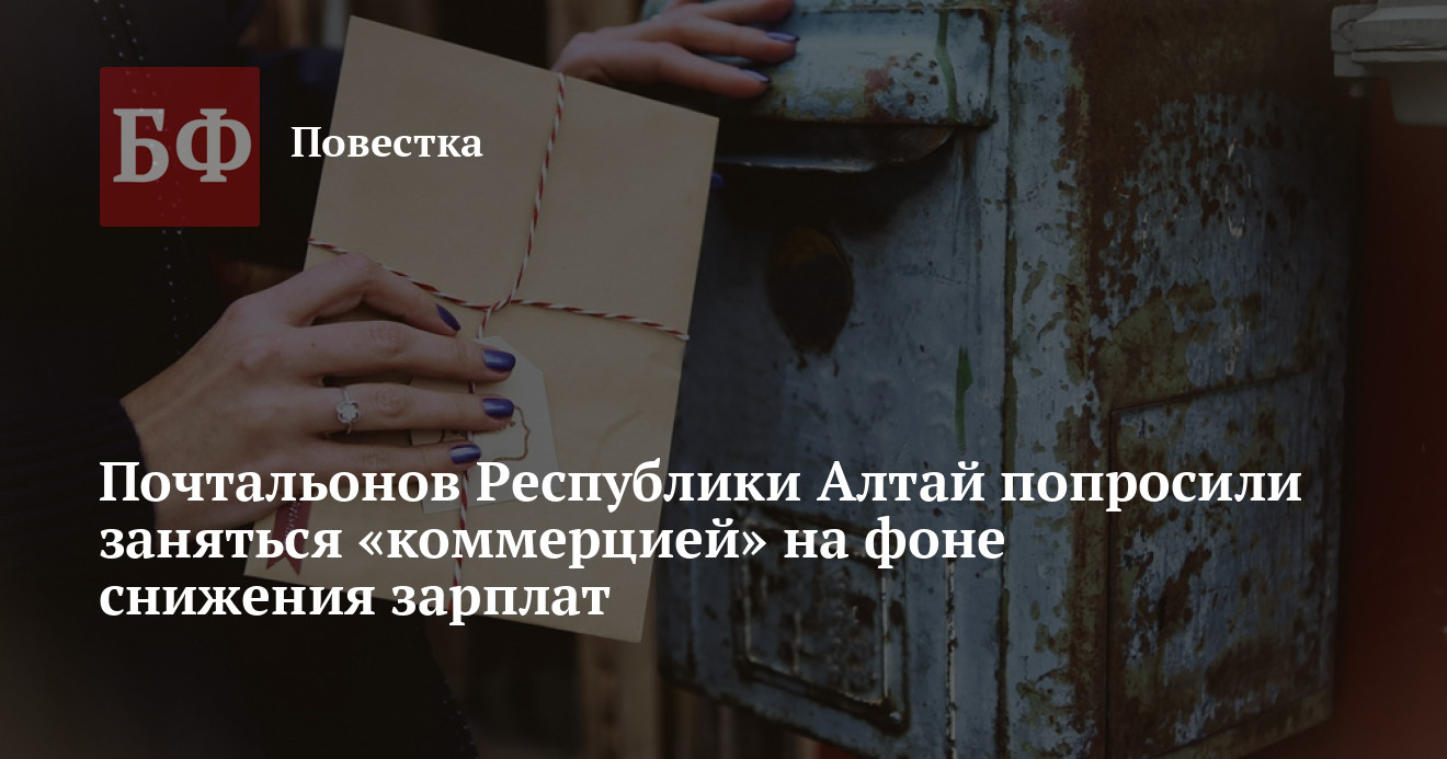 В исполком ОНФ в Республике Алтай обратилась начальник отделения почты в селе Каракокша Чойского района Наталья Хворова, которая пожаловалась на урезание окладов своих коллег. Гарантированная зарплата почтальонов, по ее словам, теперь составляет семь тысяч рублей. А чтобы получить еще примерно такое же вознаграждение, нужно продать товары и услуги на сумму около 150 тысяч рублей. Общественники попросили разъяснений у руководства республиканского Управления Федеральной почтовой связи. Ранее стало известно о сокращении зарплат у сельских почтальонов Алтайского края, что потянуло за собой исход кадров и обращение депутатов АКЗС в правительство РФ и АО «Почта России».