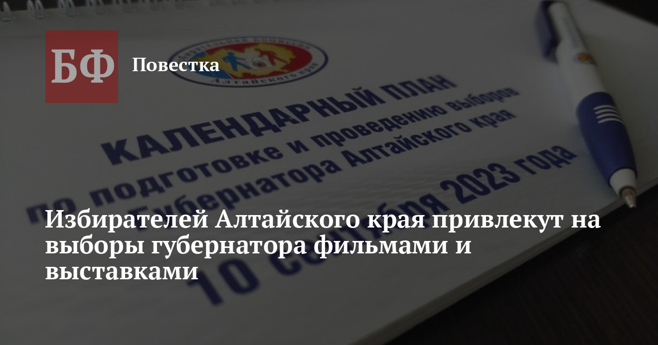 Напомним, что 10 сентября 2023 года в Алтайском крае состоятся выборы губернатора. На сегодняшний день документы в Крайизбирком подали: Виктор Томенко («Единая Россия»), депутат Госдумы Мария Прусакова (КПРФ), депутат Алтайского Заксобрания Сергей Булаев (ЛДПР), депутат АКЗС Евгения Боровикова («Справедливая Россия — За правду»), депутат АКЗС Сергей Малинкович («Коммунисты России»), руководитель Фонда имущества региона, куратор Изумрудного парка Владислав Вакаев («Новые люди»), депутат АКЗС, директор Института клинической медицины АГМУ Елена Хрусталева («Партия Пенсионеров»), заведующий лабораторией водной экологии ИВЭП СО РАН Владимир Кириллов («Зеленые»), доцент Института гуманитарных наук АлтГУ Виктор Нагайцев («Зеленая альтернатива»). В настоящее время они собирают подписи депутатов для прохождения муниципального фильтра.