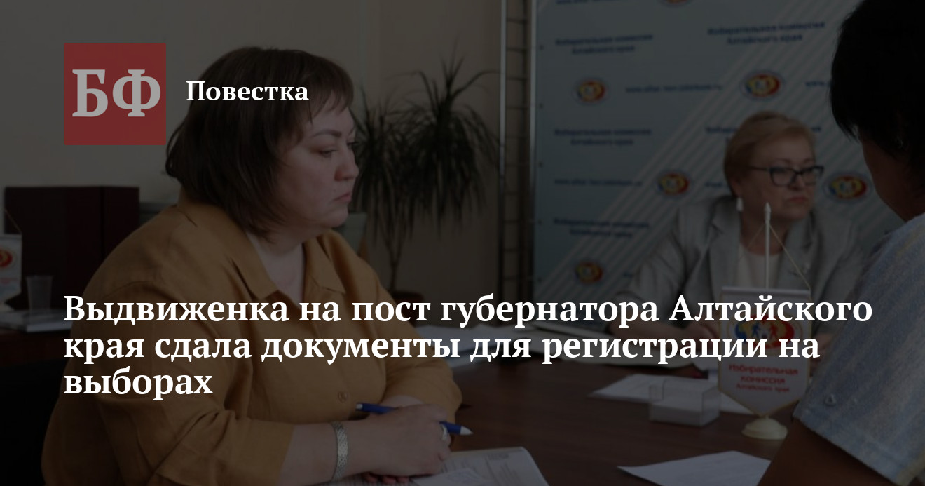 24 июля претендент на должность главы Алтайского края, депутат Заксобрания Евгения Боровикова подала необходимый пакет документов в Крайизбирком на регистрацию в качестве кандидата. Представительница социалистов собрала 527 подписей муниципальных глав и депутатов для прохождения мунфильтра. Это максимально разрешенный объем поддержки, который можно сдать в комиссию на проверку. Таким образом, парламентарий оказалась второй, кто предоставил бумаги для регистрации.