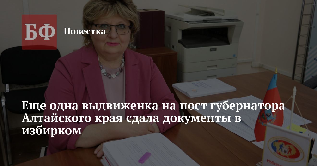 Алтайкрайизбирком 28 июля принял еще один пакет документов для регистрации в качестве кандидата в губернаторы Алтайского края. Как сообщает пресс-служба комиссии, подписные листы сдала директор Института клинической медицины АГМУ Елена Хрусталева, выдвинутая «Партией Пенсионеров».