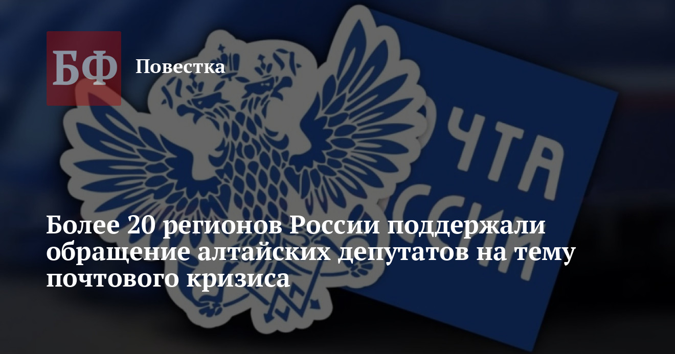 Обращение депутатов Алтайского Заксобрания в правительство РФ по вопросу оптимизации почтовых отделений нашло большую поддержку в других регионах. Вице-спикер АКЗС Денис Голобородько в своем Telegram-канале сообщил, что данная проблема актуальна еще более чем для 20 российских субъектов.