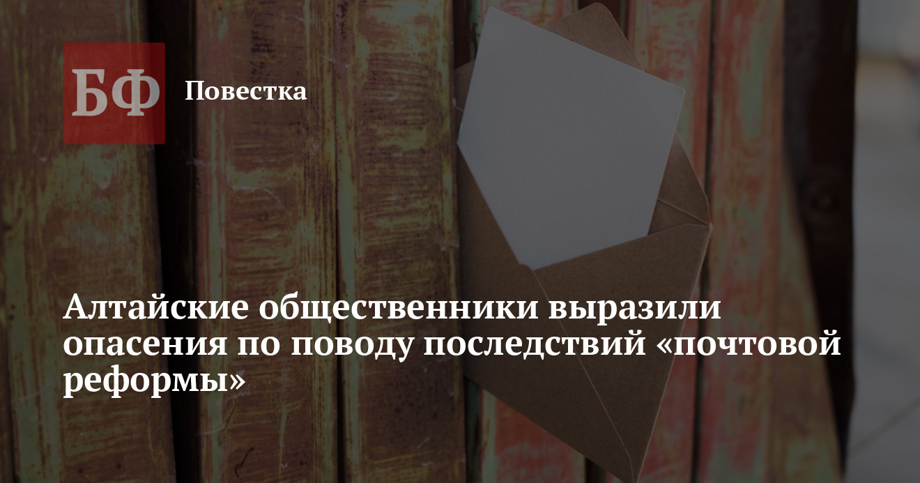 Краевой исполком Общероссийского народного фронта (ОНФ) публично обратился к руководству АО «Почта России» и министру связи РФ по поводу почтового кризиса, который разразился в ряде регионов, включая Алтайский край. Как заявили общественники, проведенная компанией «реформа», связанная с сокращением зарплат сельским почтальонам, привела к тому, многие из них уволились, а замену им не нашли. В результате в ряде муниципалитетов прекратилась доставка пенсий, прочих выплат, писем и периодики. Например, такая ситуация сложилась в девяти селах Красногорского района Алтайского края. Люди говорят, что ситуация продолжается уже месяц.