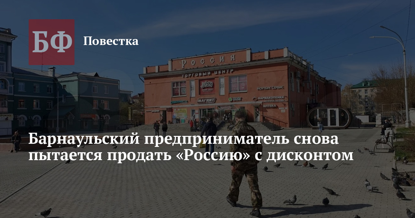 К объявлению прилагается проморолик годичной давности от владельца брокера коммерческой и элитной жилой недвижимости «Алтайская элита» Олега Гильгенберга, в котором он рассказывает о продаваемом здании. В нем он упоминает, что постройкой будто бы интересовались два «крупных международных бренда», с которыми велись переговоры. С его слов выходит, что потенциальные покупатели намеревались согласовать с мэрией Барнаула вопрос о создании подъездов к «России» и организовать там круговое движение. Очевидно, реализация такого проекта предусматривала частичный или полный отказ от площади перед ТЦ. Также Гильгенберг подчеркивал, что, несмотря на историю здания, будущего владельца в его планах будет ограничивать только одно обязательство: сохранение переднего фасада, который, по примеру барнаульского ЖК «Локомотив» на проспекте Строителей, можно вписать в более крупное здание и застроить территорию.