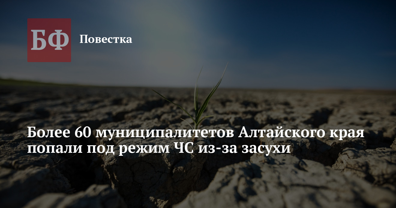 Ранее глава Алтайского края сообщил, что с апреля по август наблюдалась засуха, которая значительно осложнила обстановку в сельском хозяйстве. Суховеи, почвенная и атмосферная засуха коснулись всех районов региона, что отразится на урожае и заготовке кормов, отмечал Томенко. В связи с этим в августе прошло заседание комиссии по предупреждению и ликвидации чрезвычайных ситуаций, на котором, с учетом обстоятельств на полях, приняли решение ввести режим ЧС. Предполагается, что это позволит смягчить последствия засухи для аграриев: они смогут получить компенсации по договорам страхования своих угодий, а также у них появится возможность пролонгации кредитов.